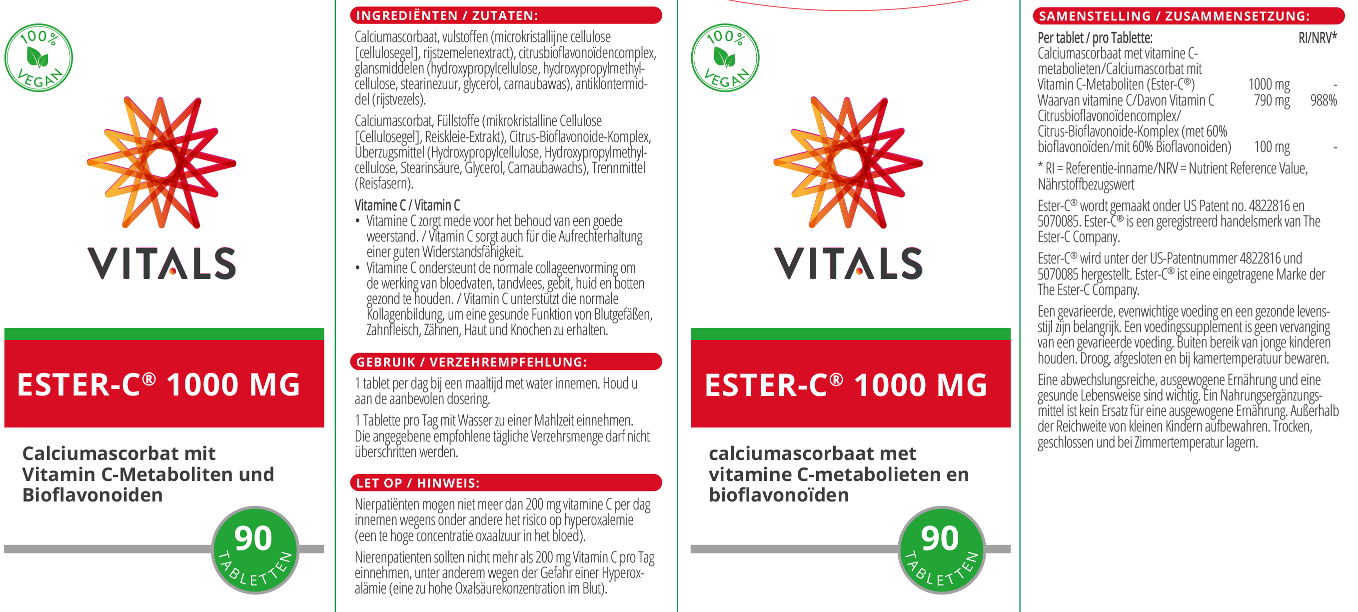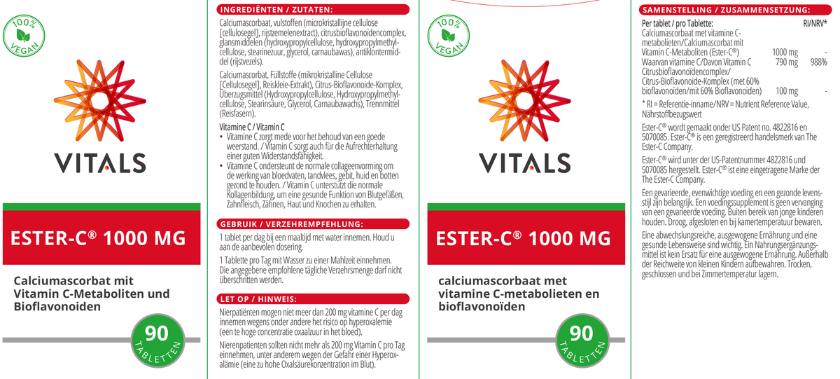 Calciumascorbaat (Ester-C®), vulstof (microkristallijne cellulose [cellulosegel]), citrusbioflavonoïdencomplex, rijstextract (Oryza sativa), glansmiddelen (hydroxypropylcellulose, hydroxypropylmethylcellulose, stearinezuur, glycerol, carnaubawas), rijstconcentraat (Oryza sativa).