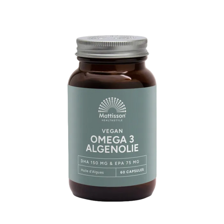 Algenolie is een 100% plantaardig Omega-3 supplement (DHA 150 mg & EPA 75 mg) en wordt gemaakt van gekweekte algen. Het is hiermee een duurzame en vegan vervanger voor omega-3 supplementen uit visolie.