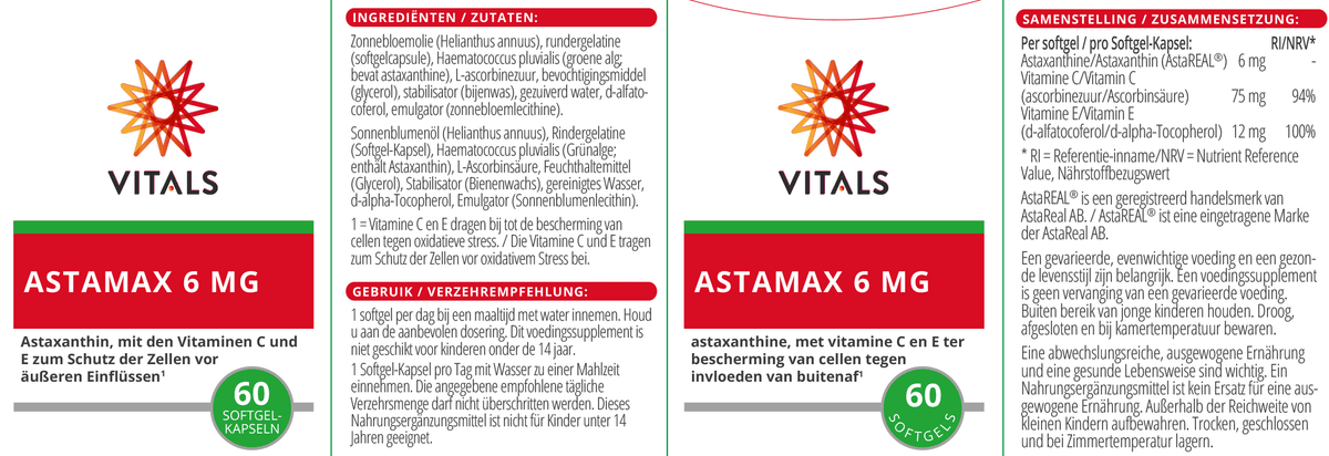 Omdat onderzoek laat zien dat veelal hogere doseringen (6-12 mg per dag) aan te bevelen zijn, bevat Astamax maar liefst 6 mg astaxanthine per softgelcapsule, aangevuld met antioxidanten vitamine C en vitamine E.