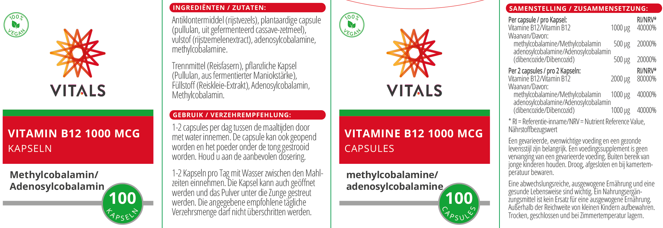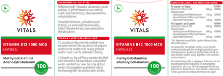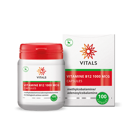 Vitamine B12 1000 mcg Capsules van Vitals bestaat uit vegetarische capsules met de biologisch actieve vormen methylcobalamine en adenosylcobalamine (ook wel dibencozide genoemd). Dit zijn de vormen zoals vitamine B12 in de voeding voorkomt en door het lichaam gebruikt wordt. In veel andere vitamine B12-producten wordt gebruikgemaakt van cyanocobalamine, een synthetische vorm die zo niet in de natuur voorkomt.